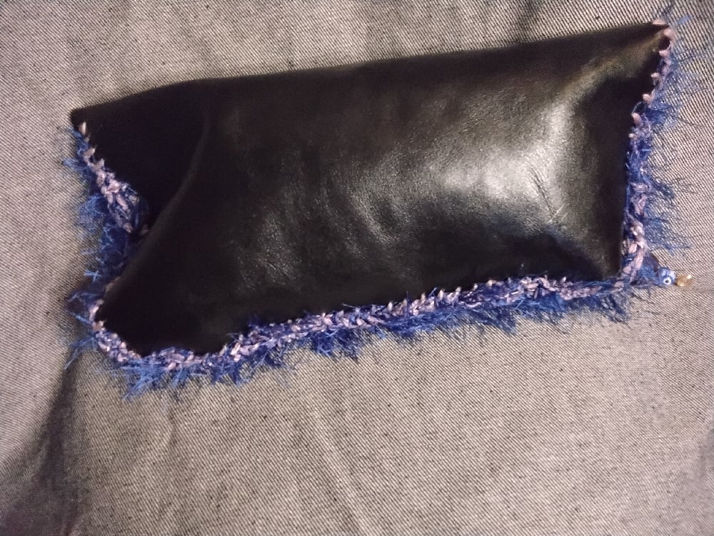 Black leather envelope styled clutch bag with blue croched front...it has a button closure ...unique handmade bag
