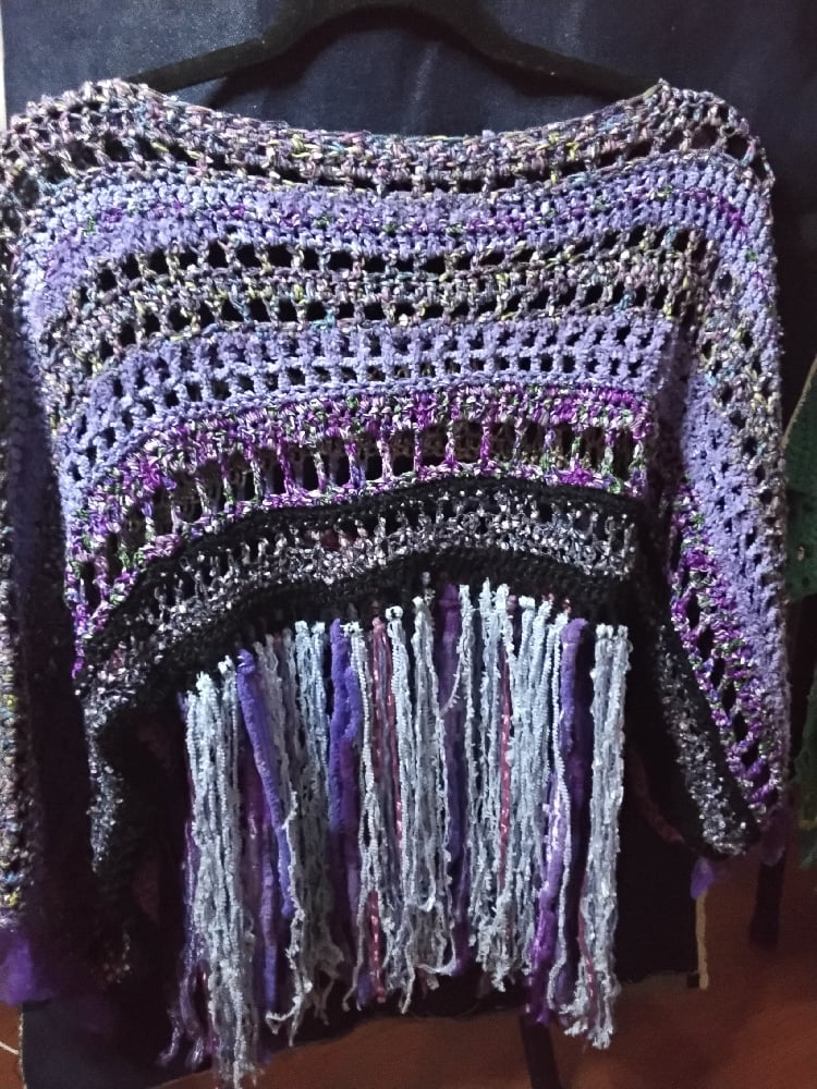 Crocheted boatneck pullover with long fringe...multi colored (mostly purple)..3/4 sleeves