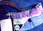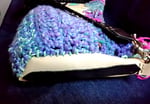 Off white and black leather combined with blue and purple crochet bag lined with silk