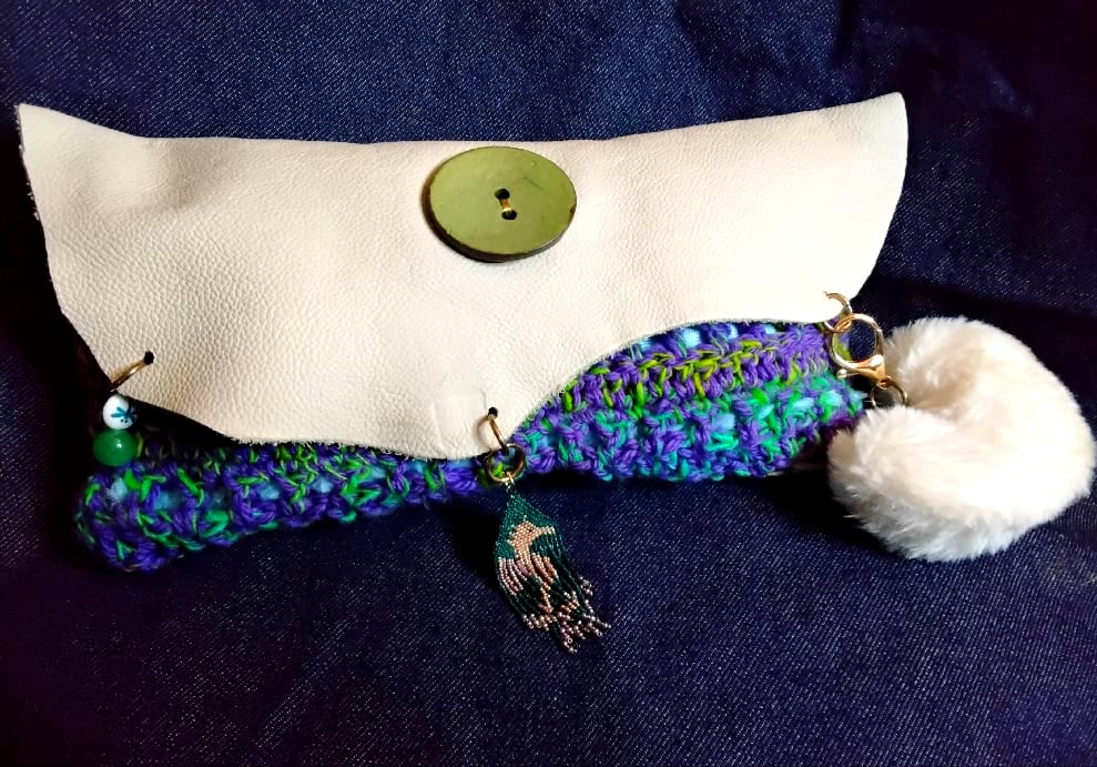 Off white leather clutch bag with crocheted front and fuzzy heart bag charm