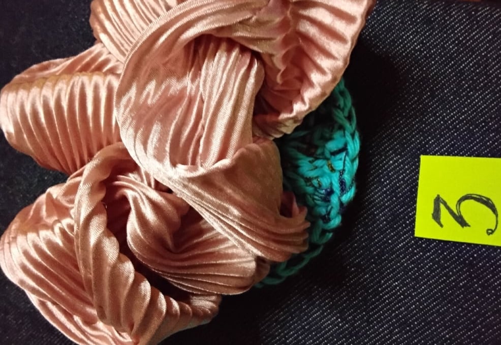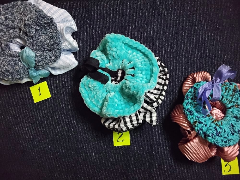 Three sets of two hair scrunchies sets sold individually...fabric as well as one crocheted..