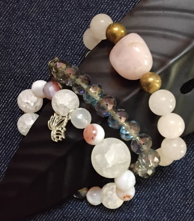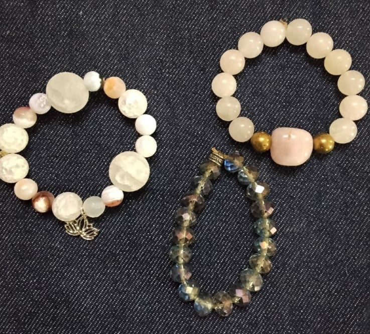 Bracelets consisting of...rose quartz,hematite, white agate,crystal beads & a lotus charm